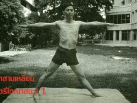 - แยกเท้าออกจากกันห่างประมาณสามช่วงไหล่ ให้ปลายเท้าชี้ไปข้างหน้า ยกมือขึ้นเท้าสะเอว