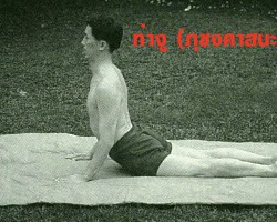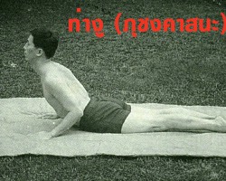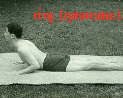 - หายใจออก ใช้ศอกกดกับพื้นยกลำตัวส่วนบนขึ้น หงายศีรษะกลับหลังเท่าจะทำได้แล้ววางลงกับพื้นหายใจเข้าออกสม่ำเสมอ