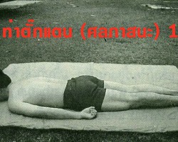 - นอนคว่ำกับพื้นให้นิ้วหัวแม่เท้าชิดกัน ส้นเท้าแยกจากกัน คว่ำฝ่ามือซ้อนทับกันแล้ววางลงกับพื้น วางศีรษะลงบนมือที่ซ้อนทับกันนั้น โดยตะแคงใบหน้า ไปทางด้านใดด้านหนึ่ง (ภาพ 43) หายใจเข้าออกสม่ำเสมอ