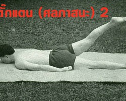 - หายใจออก ยกขาทั้งสองข้างขึ้นพร้อมกันให้สูงที่สุดเท่าที่จะเป็นไปได้ เข่าตึง (ภาพ 50) หายใจเข้าออกสม่ำเสมอ 3-5 รอบ