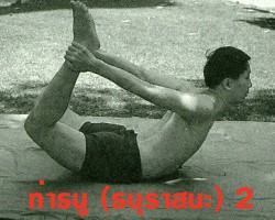 - หายใจออกพร้อมกับเหยียดท่อนขากลับหลังและยกต้นขาขึ้นจากพื้นให้มากที่สุดในขณะที่มือจับข้อเท้าไว้แน่น เงยศีรษะขึ้น (ภาพ 52) หายใจเข้าออกสม่ำเสมอ 2-3 รอบ