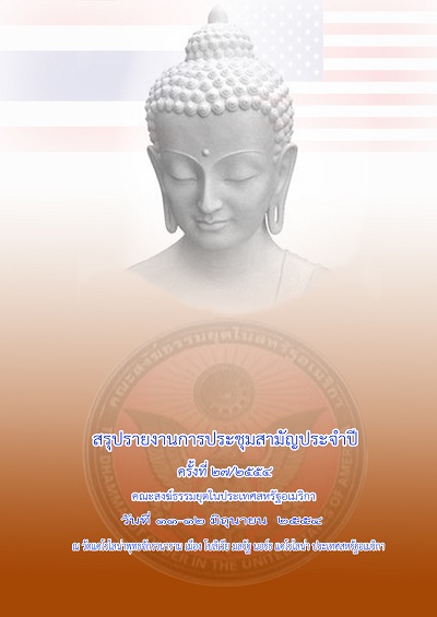 คำนำ คณะสงฆ์ธรรมยุตได้เข้ามาเผยแผ่พระพุทธศาสนาในประเทศสหรัฐอเมริกา เป็นเวลาเกือบ ๓๐ กว่าปี โดยพระธรรมทูตชุดแรก ๆ ได้รวบรวมศรัทธาญาติโยมสร้างวัดขึ้นมา ต่อมาเมื่อมีวัดเพิ่มจำนวนมากขึ้น จึงได้จัดเป็นองค์กรขึ้น เพื่อบริหารงานเผยแผ่พระพุทธศาสนาให้มีประสิทธิภาพยิ่งขึ้น ภายใต้ชื่อว่า “คณะสงฆ์ธรรมยุตในประเทศสหรัฐอเมริกา” ในการบริหารมีคณะกรรมการแบ่งเป็น ๒ ประเภท ได้แก่ ๑. คณะกรรมการอำนวยการ เจ้าอาวาสวัดธรรมยุตในสหรัฐอเมริกา เป็นกรรมการอำนวยการโดยตำแหน่ง ๒.คณะกรรมการบริหาร จากการเลือกตั้งของคณะกรรมการอำนวยการ และแต่งตั้งโดยเจ้าคณะ ใหญ่ธรรมยุต มีจำนวน ๗ ท่าน ประกอบด้วย ประธาน, รองประธาน ๒ รูป, เลขานุการ, ผู้ช่วยเลขานุการ ๒ รูป, และเหรัญญิก มีวาระคราวละ ๒ ปี นอกจากนี้ยังกำหนดให้มีการจัดประชุมสามัญประจำปี ปีละ ๑ ครั้ง เพื่อพบปะปรึกษาหารือในการ บริหารวัดและงานเผยแผ่พระพุทธศาสนา ในการประชุมแต่ละครั้ง ย่อมมีการบันทึกการประชุมเพื่อเป็น เอกสารเก็บไว้เป็นหลักฐาน สำหรับการประชุมสามัญประจำปี ๒๕๕๔ ครั้งที่ ๒๗/๒๕๕๔ ณ วัดแคโรไลน่า พุทธจักรวนาราม วันที่ ๑๑-๑๒ มิถุนายน ๒๕๕๔ ทางกองงานเลขานุการได้สรุปบันทึกการประชุมดังที่เคย ปฏิบัติมา และจัดเป็นรูปเล่มดังที่ปรากฏขณะนี้ ฉะนั้น หนังสือสรุปรายงานการประชุมสามัญประจำปีเล่มนี้คงจะมีประโยชน์ไม่มากก็น้อย และขอ ขอบพระคุณพระเถรานุเถระจากประเทศไทย พระธรรมทูต ขออนุโมทนา เจ้าหน้าที่จากสำนักงานพระพุทธศาสนาแห่งชาติ ที่เข้าร่วมประชุม และทุกท่านโดยเฉพาะ เจ้าภาพ คือวัดแคโรไลน่าพุทธจักรวนาราม พร้อมทั้งอุบาสกอุบาสิกา ที่มีส่วนช่วยทำให้การประชุมสามัญประจำปี ครั้งที่ ๒๗/๒๕๕๔ นี้ สำเร็จลุล่วงไปด้วยดี หากมีการผิดพลาดหรือไม่ถูกต้องด้านข้อมูล กรุณาแจ้งให้ผู้จัดทำได้รับทราบ เพื่อจะได้แก้ไขให้ถูกต้องในโอกาสต่อไป อนึ่ง ในที่ประชุมได้กำหนดให้ วัดพุทธดัลลัส เป็นสถานที่จัดประชุมสามัญประจำปี ครั้งที่ ๒๘ /๒๕๕๕ ระหว่างวันที่ ๑๖ - ๑๗ มิถุนายน พ.ศ. ๒๕๕๕