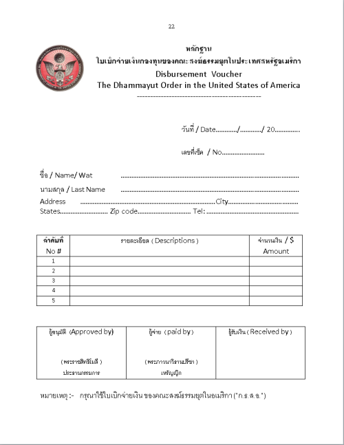 ๓.๒ ค่าใช้จ่ายเพื่อสนับสนุนการเผยแผ่ สิ่งตีพิมพ์ อันเกี่ยวข้อกับงานของคณะสงฆ์ ๓.๓ ค่าใช้จ่ายเพื่อสนับสนุนองค์กรการกุศลต่างๆ อันเกิดจากภัยธรรมชาติในประเทศ และต่างประเทศ ๓.๔ ค่าใช้จ่ายเพื่อการบริหารจัดการ ในองค์กรของคณะสงฆ์ธรรมยุตในอเมริกาเช่น งานประชุมสงฆ์ ช่วยเหลือภิกษุสงฆ์ หรือ พระธรรมทูตที่เข้ามาปฏิบัติศาสนกิจ ในระเบียบของสำนักกำกับดูแล พระธรรมทูตไปยังต่างประเทศ (๔) หลักฐานในการจ่ายเงินของกองทุน ๔.๑ การจ่ายเงินตามวัตถุประสงค์ ข้อ ๗ ถึง ข้อ ๑๒ กองทุนต้องจัดให้มีหลักฐานใบสำคัญการจ่ายเงิน ให้คณะกรรมการเป็นผู้กำหนดแบบขึ้นเอง ในกรณีผู้มีสิทธิ์รับเงินไม่สามารถมารับเงินได้ด้วยตนเอง ต้องให้เจ้าอาวาสของวัดมอบหมาย ไวยาวัจกรวัดนั้น ๆ เป็นผู้รับแทน ๔.๒ การจ่ายเงินโดยการโอนผ่านธนาคาร ให้กองทุนเก็บหลักฐานการนำเงินเข้าบัญชีของผู้มีสิทธิ์รับเงินไว้เป็นหลักฐาน ทั้งนี้ คณะกรรมการอาจกำหนดให้มีหลักฐานการจ่ายเงินในรูปแบบอื่นเพิ่มเติม ได้ตามที่เห็นสมควร ข้อ ๑๖ ให้ใช้ระเบียบนี้ ตั้งแต่บัดนี้เป็นต้นไป